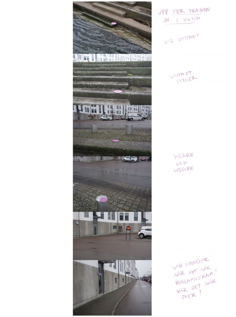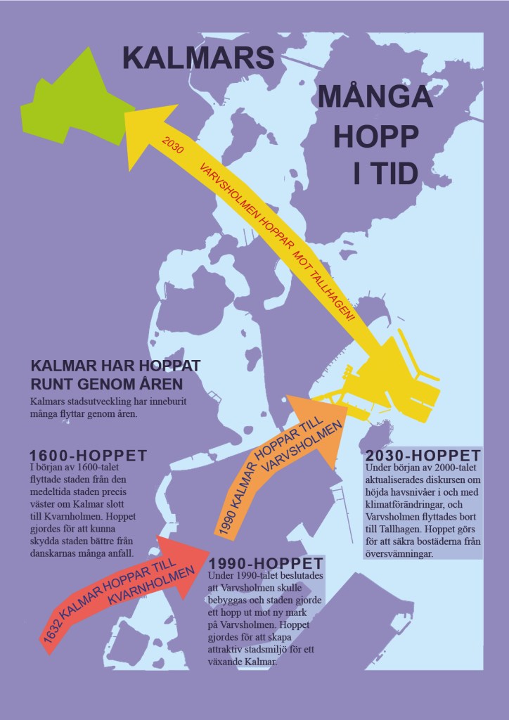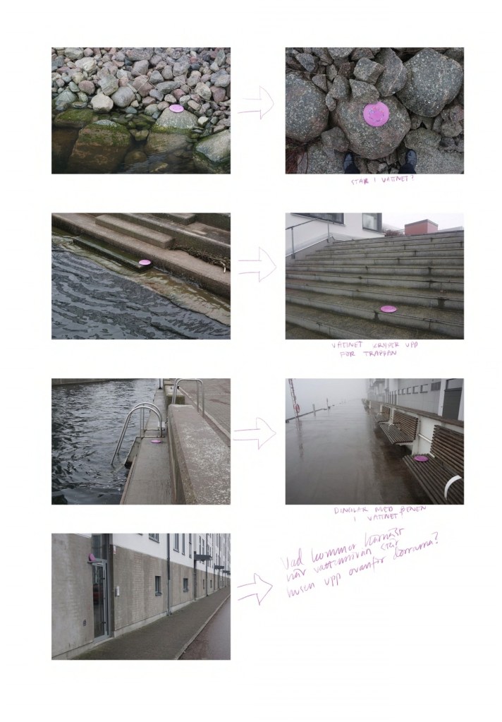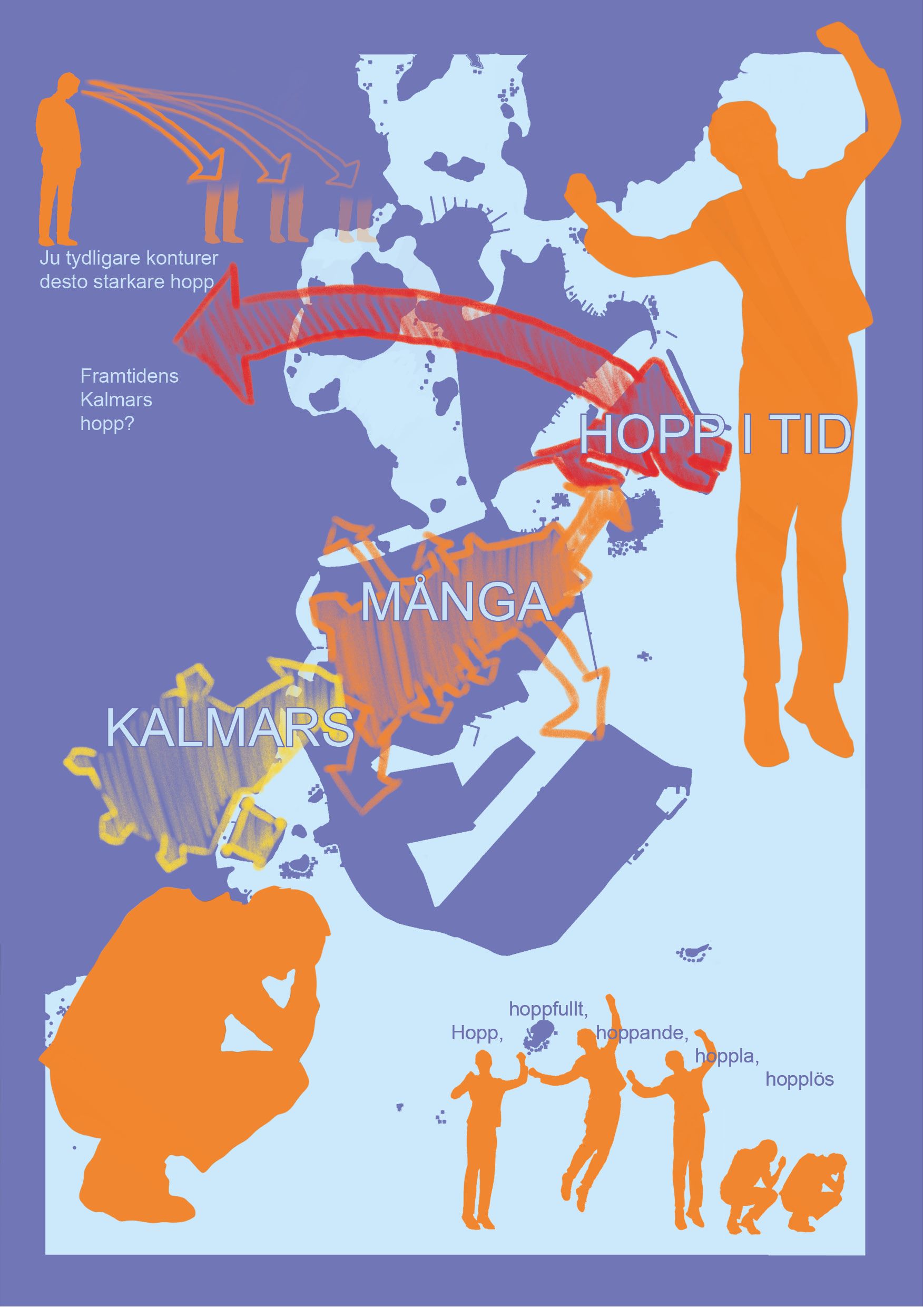 Stigande havsnivåer till följd av klimatförändringar ställer till allvarliga problem för våra stadsplanering. Inom en masterkurs använde jag utforskande metoder för att möta detta. Inom mitt projekt, Hopp i Kalmar, utforskade jag Kalmars historiska stadsutveckling, nutida stadsplanering och pågående stadsdelsprojekt på Varvsholmen i relation till stigande havsnivåer. Hopp blev en metafor att ta spjärn mot för att utveckla projektet framåt.
