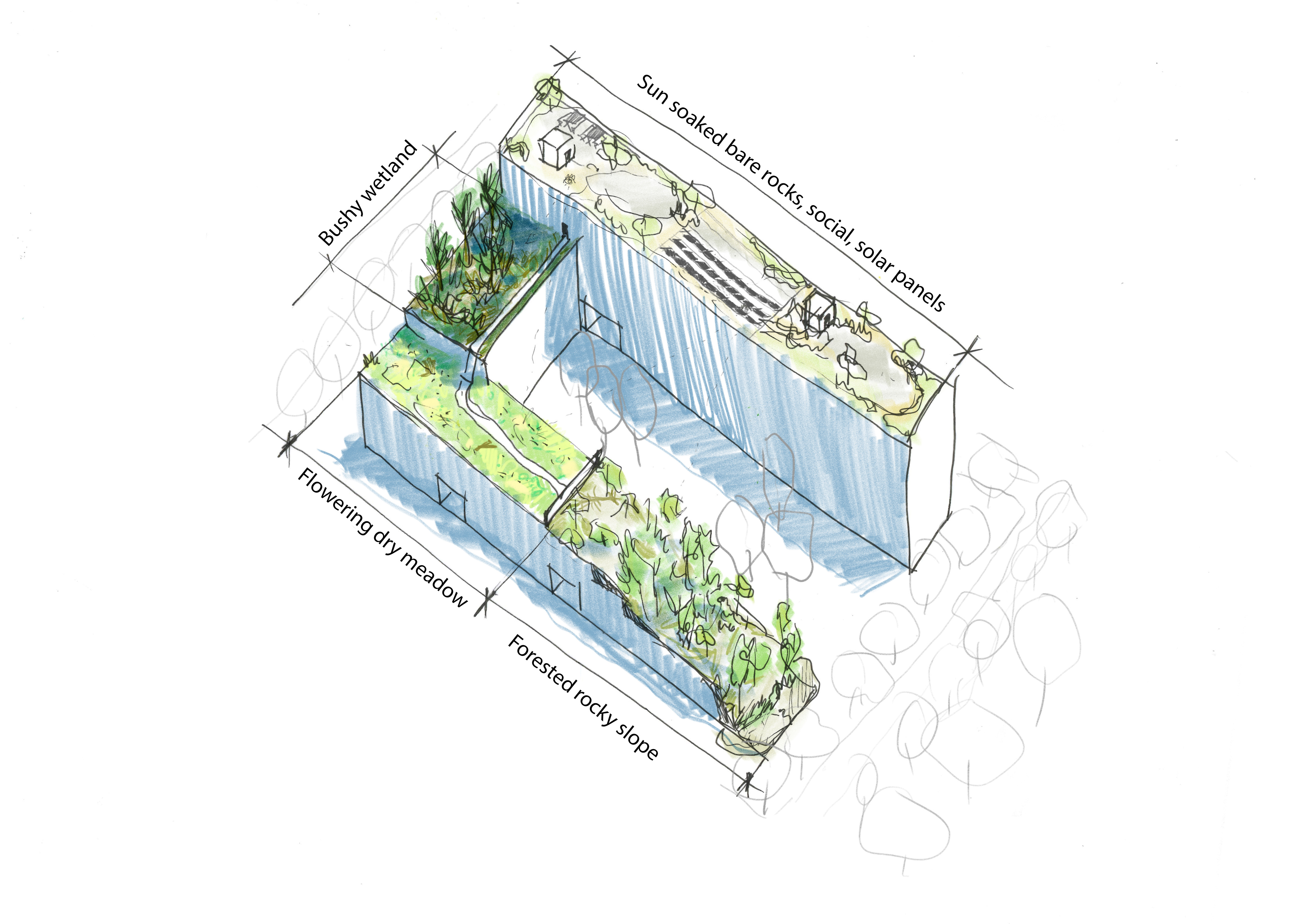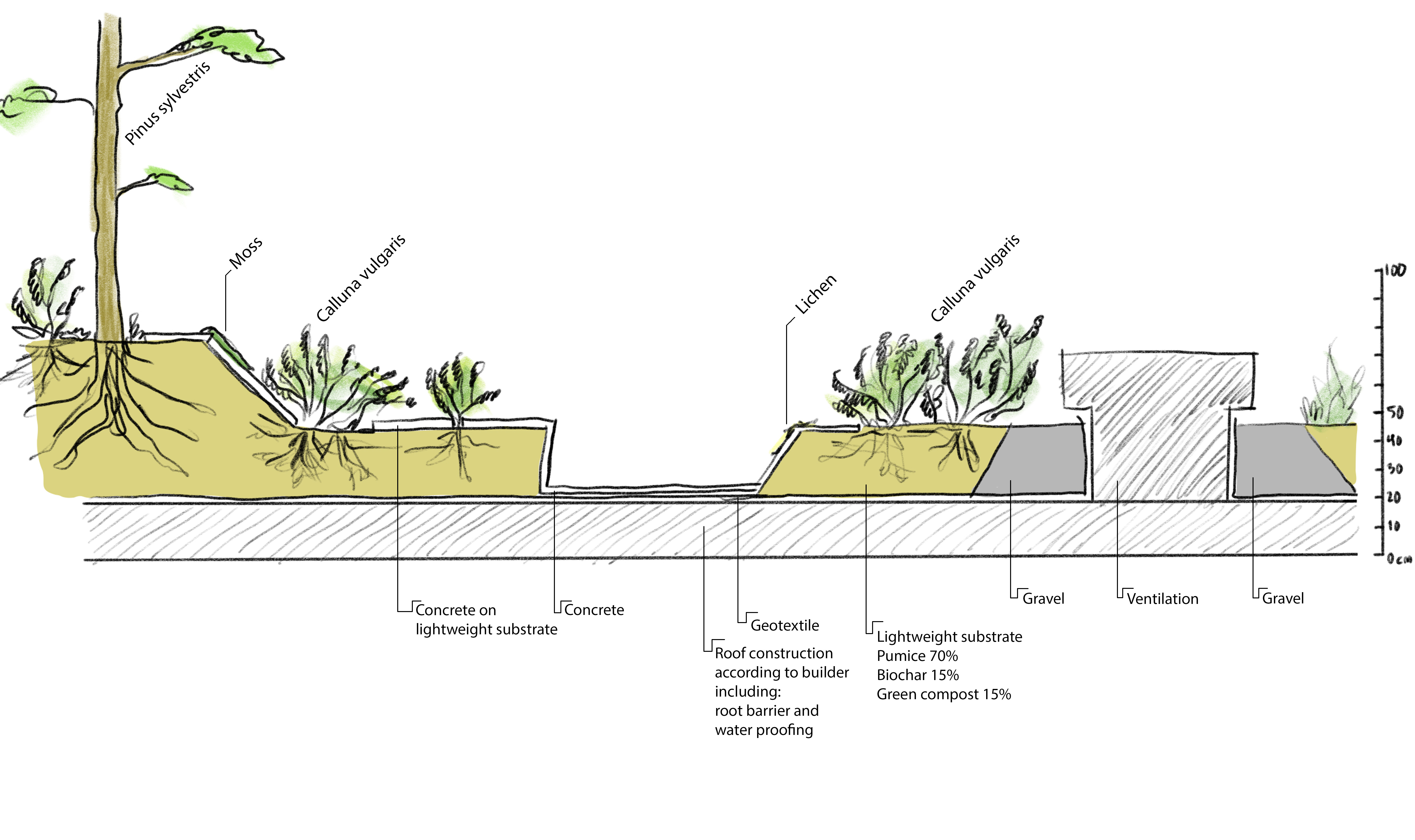 Ett grönt tak i Uppsalas planerade nya Södra stadsdelarna. Som en del av kursen i urbanekologi undersökte vi den planerade bebyggelsen och som studioprojekt gestaltade vi ett grönt tak i sammanhanget. We used to sit on the sun soaked bare rocks, kallade jag mitt förslag som tog inspiration från de habitat som försvinner från platsen och de arters användning av området som förändras, inklusive oss människor.