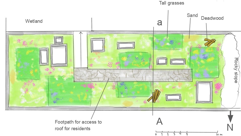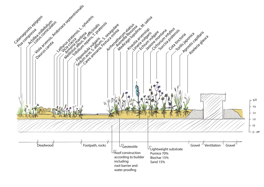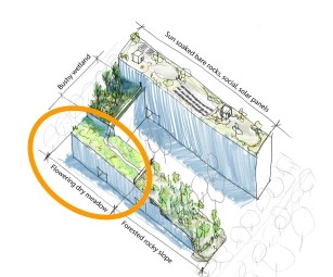 Dry meadow är en del av taket med torrängsplantering, ett vanligt inslag bland extensiva gröna tak. Det inspireras av torrängar som försvinner från området.